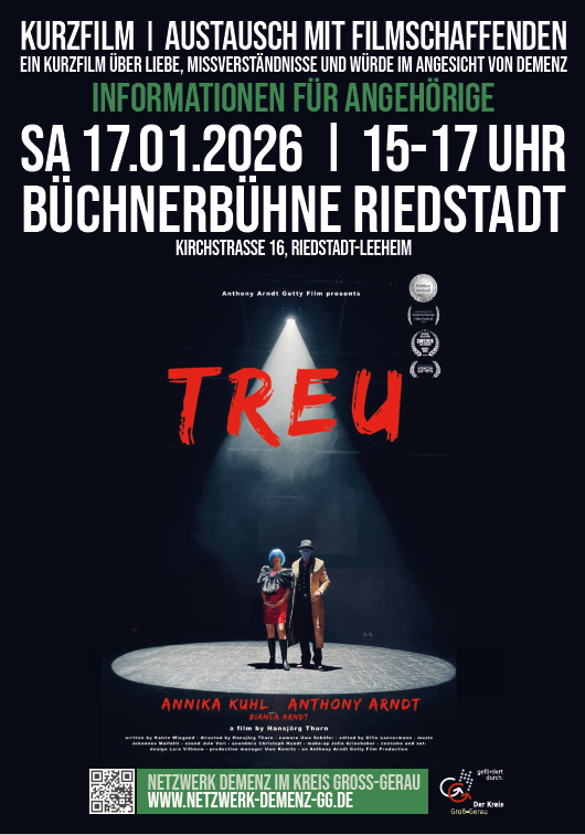 preisgekrönte Kurzfilm „TREU“ startet eine besondere Charity-Kino-Tournee, die in Kooperation mit der Deutschen Alzheimer Gesellschaft durch deutsche Städte und Kinos zieht. Ziel dieser Tournee ist es, auf die oftmals unsichtbare Belastung der Angehörigen von Menschen mit Demenz aufmerksam zu machen.Am 17.01.2026 von 15:00-17:00 Uhr gastiert die Tournee auf der BüchnerBühne in Riedstadt.